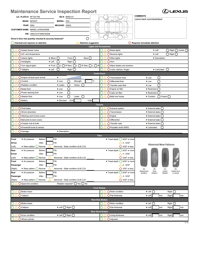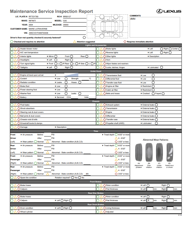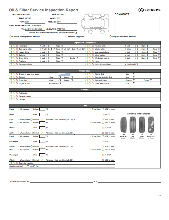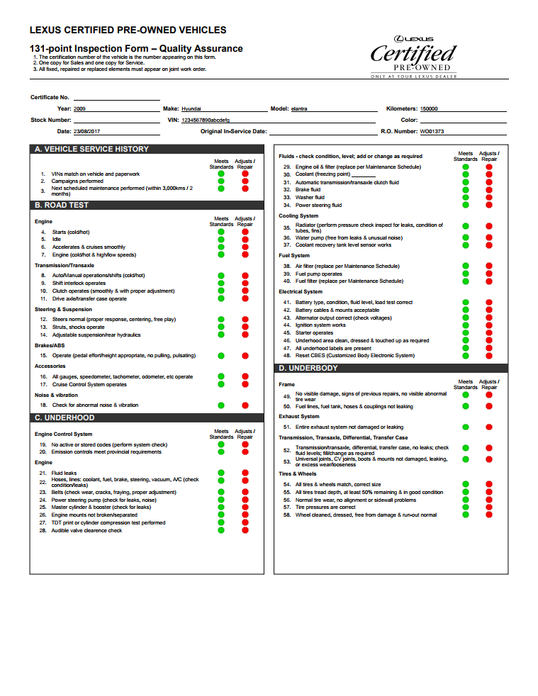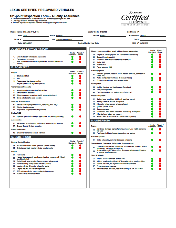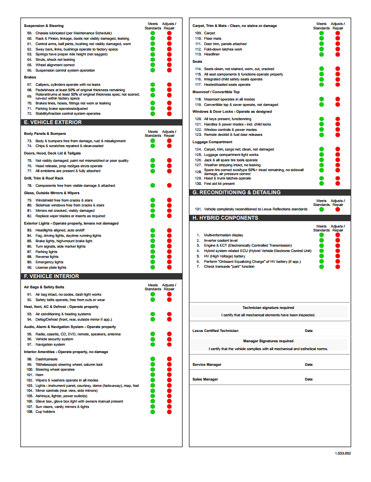 Lexus Certified Pre-Owned Vehicles - 131-point Inspection Form - Quality Assurance