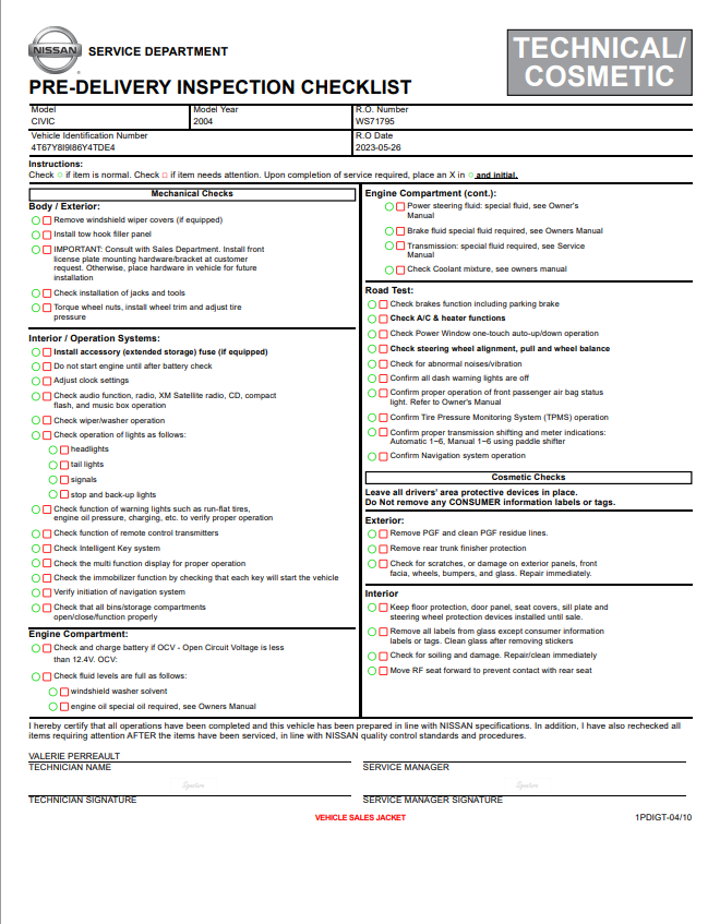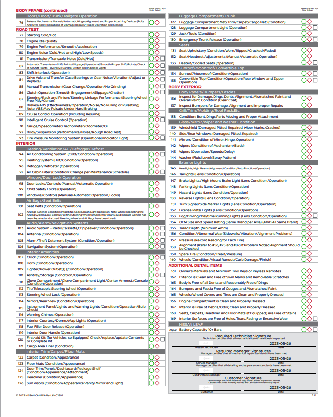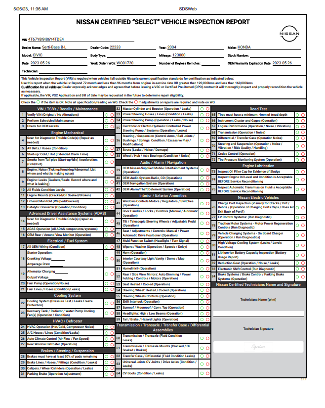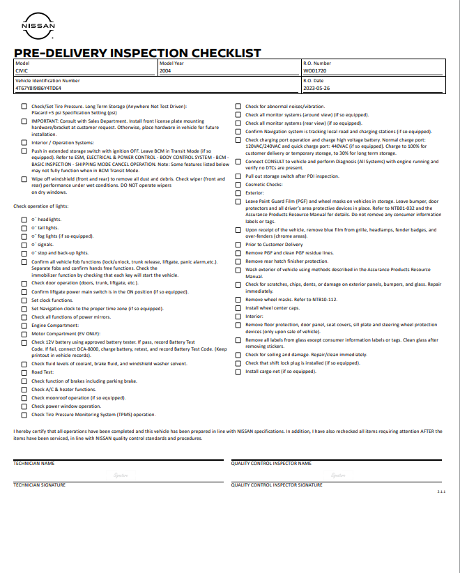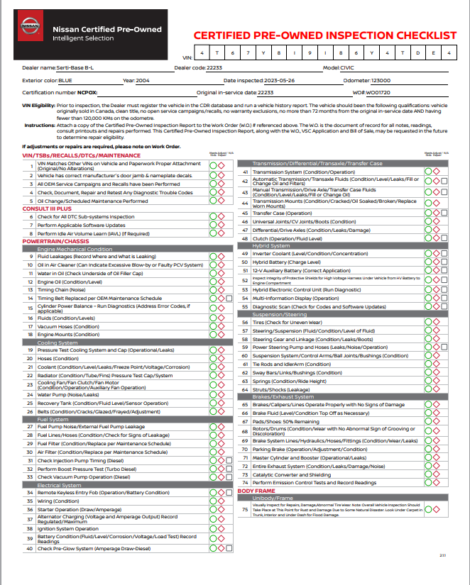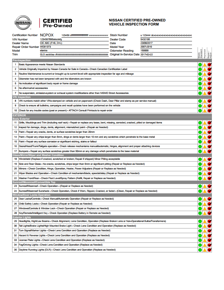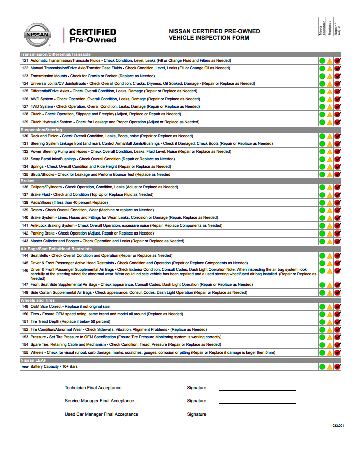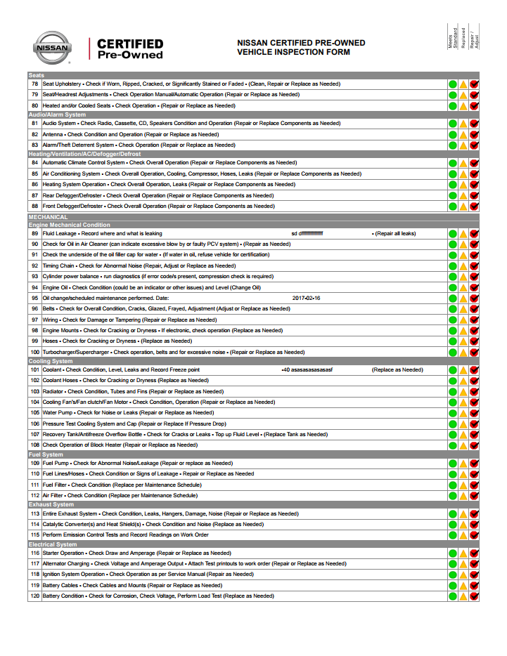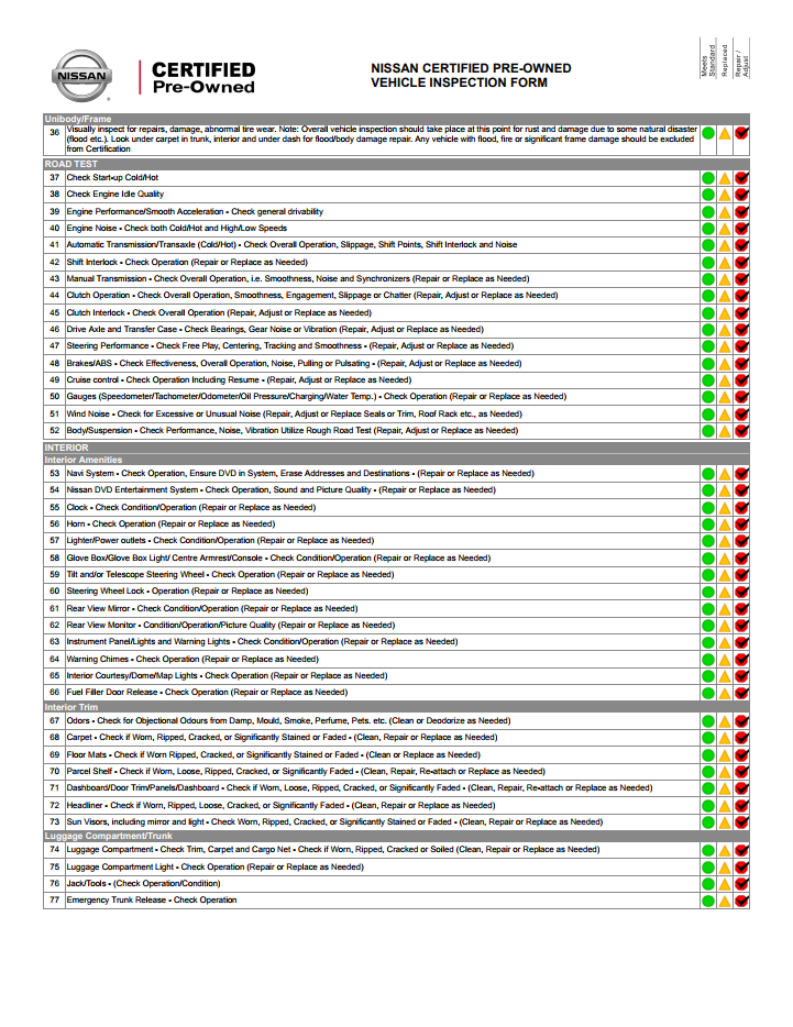 Nissan Certified Pre-Owned Vehicle Inspection Form