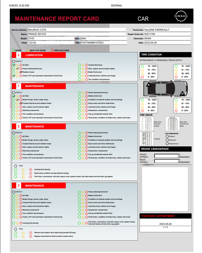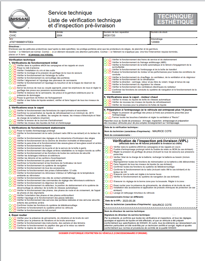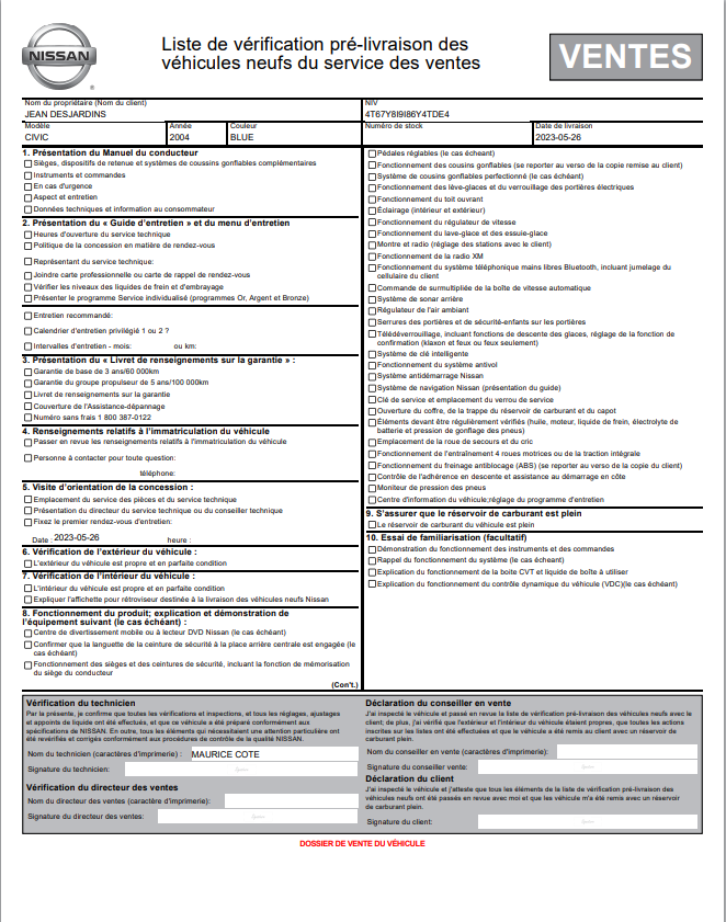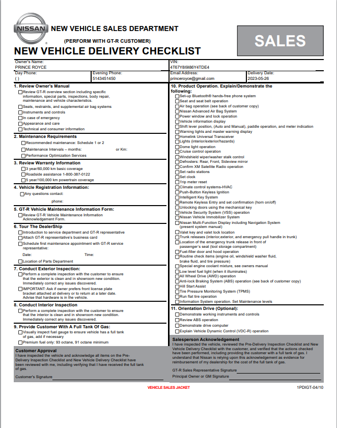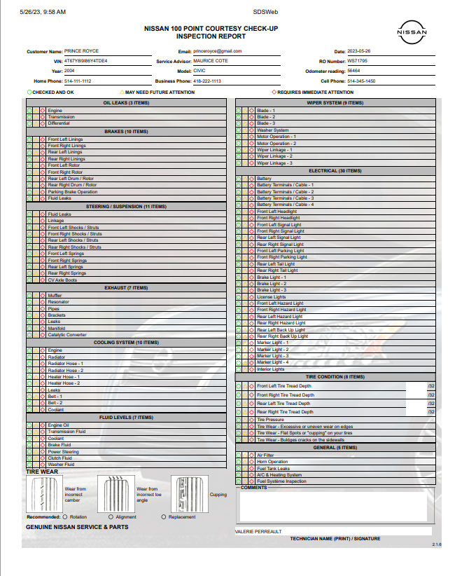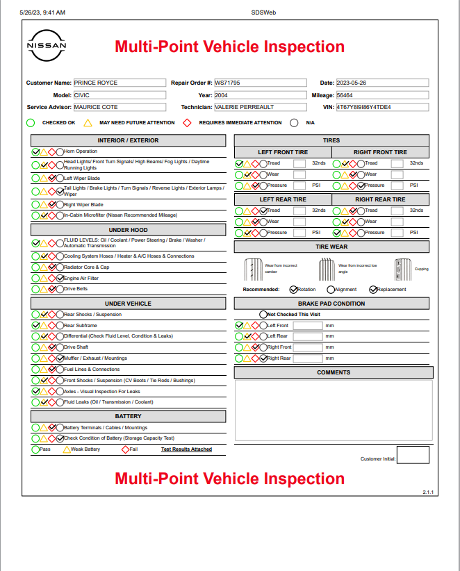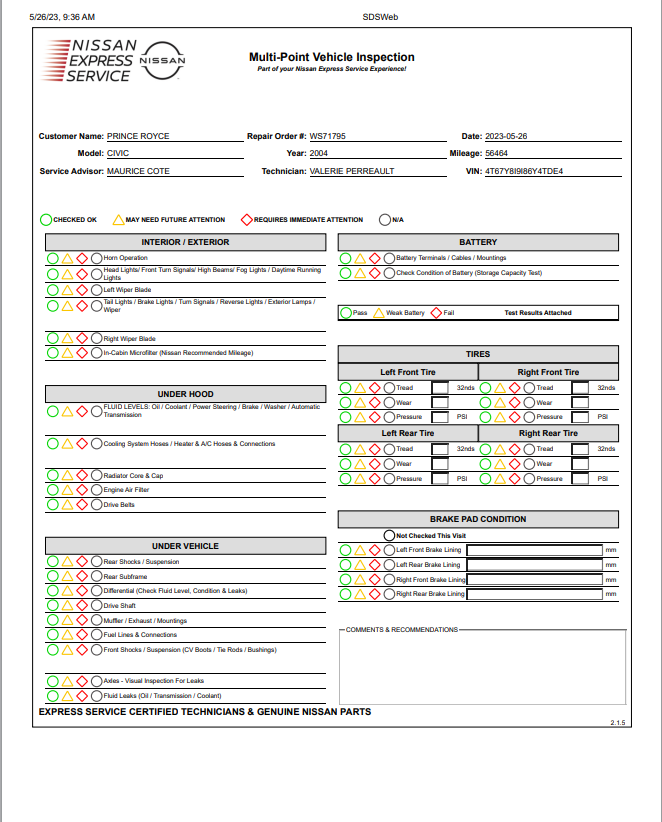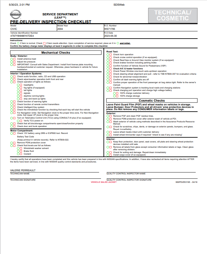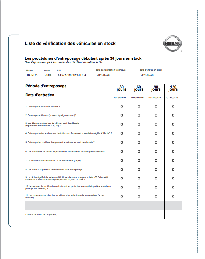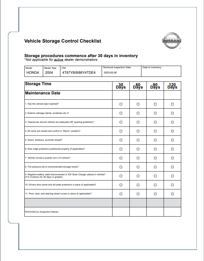 Nissan Certified Pre-Owned Vehicle Inspection Form